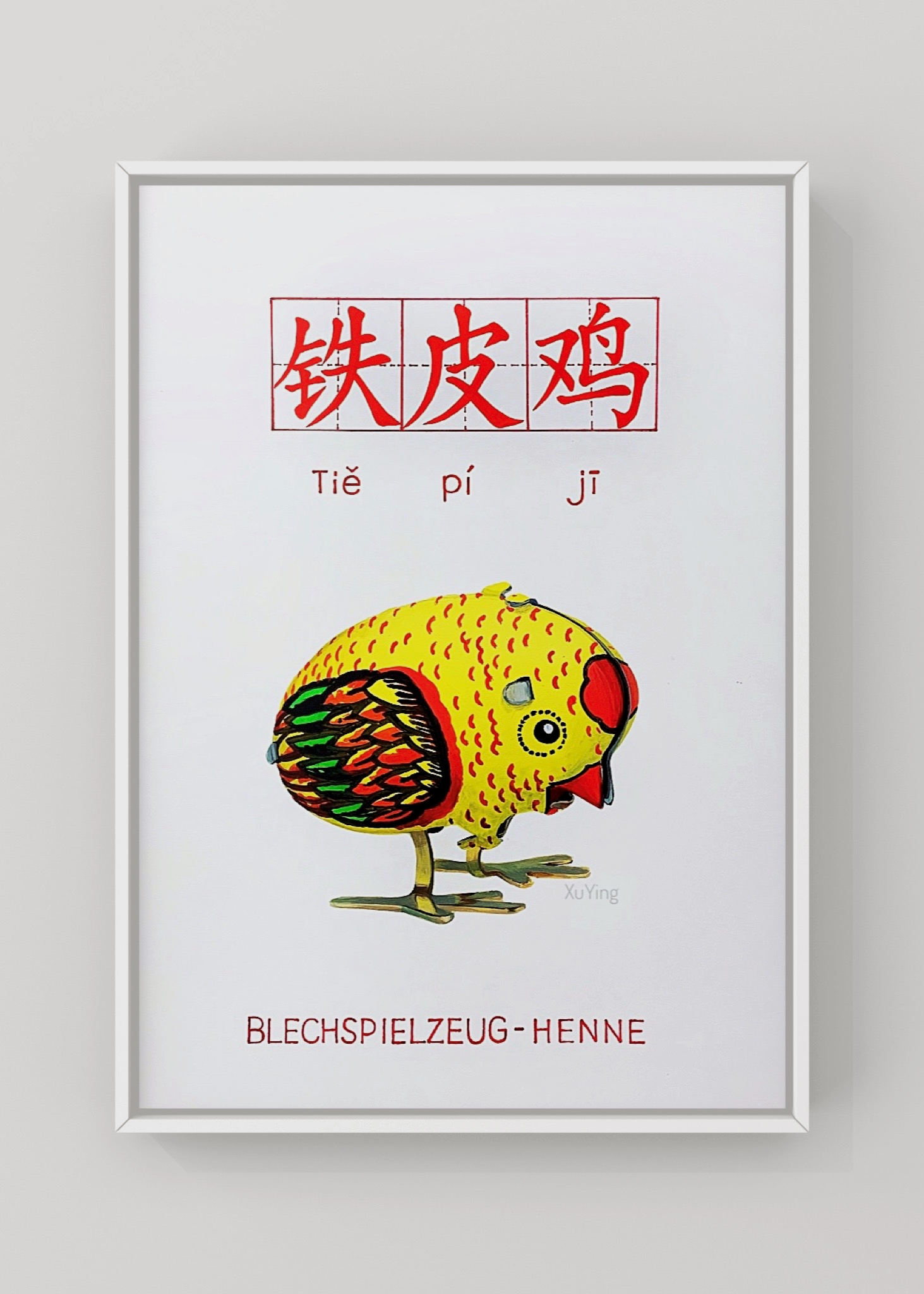 My daily life is inseparable from translating, misunderstanding, debating and re-understanding, which is sometimes tiring but also enriches me. During this learning process, I gradually developed my way of visually expressing the connection between a culturally representative item and its linguistic interpretation in another culture–my culture.Unlike my other works, the "Swiss Icon" series does not have an abstract theme which may be difficult to access and comprehend. The style and composition of the series was inspired by teaching my kids Chinese, especially the common game we usually played during our childhood: reading image cards (看图说话,Kàn tú shuō huà). It is a typical game for Chinese language training in whih Chinese characters are written in a classic four red square per character grid, followed by the transcription in Pin Yin (a system of Romanization for Chinese). In the “Swiss Icon” series the paintings and German name of the portrayed item are placed in a juxtaposed position, which creates an interesting interaction. The nature of the painting, as well as the font are an expression of my understanding of Swiss spirit: smart, clear, precise and practical.