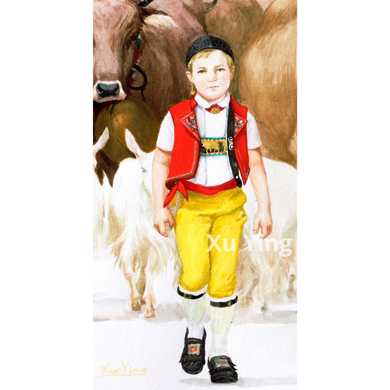 7年前的举家迁居瑞士,将我重新置入了一个陌生的环境,那时候,就像每一个初到他国的新人一样,周围的很多事物于我看来都非常新奇,自然也想知道它的由来,而能够生活在瑞士,使我比一般意义上的游客有更多的时间来了解这个新环境、感受它的人文。( 瑞士资讯报道)我不断的进行着日常的观察,在阅读、与朋友交谈和旅行中积累着那些对我而言新鲜又很‘瑞士’的点,如:阿尔卑斯山号,辫子面包,木牛,芝士火锅。可以说从来到瑞士的第一天直到现在,我的日常生活都离不开对新奇点的解疑,也离不开语言的互译,无论是与丈夫谈论文化风俗,还是与孩子们的日常沟通;无论是与闺蜜好友聊天聊地,还是与街坊邻里分享烹饪心得···语言互译、理解中的共识与误解、辩论与再认识成了我的家常便饭, 既丰富着我对瑞士的认知,也促使我对艺术的表现方式进行新的挖掘,正是这些令人兴奋的“啊哈!”瞬间,使我逐渐形成了我的表达方式,与我其他的绘画系列不同,“瑞士图标”没有深奥的题材,没有情绪化的色彩,更没有让人震撼的体量,它有的是质朴的叙事,怀旧的色彩,精炼却也精准的表达,就如同瑞士和瑞士精神给我的感受一样。